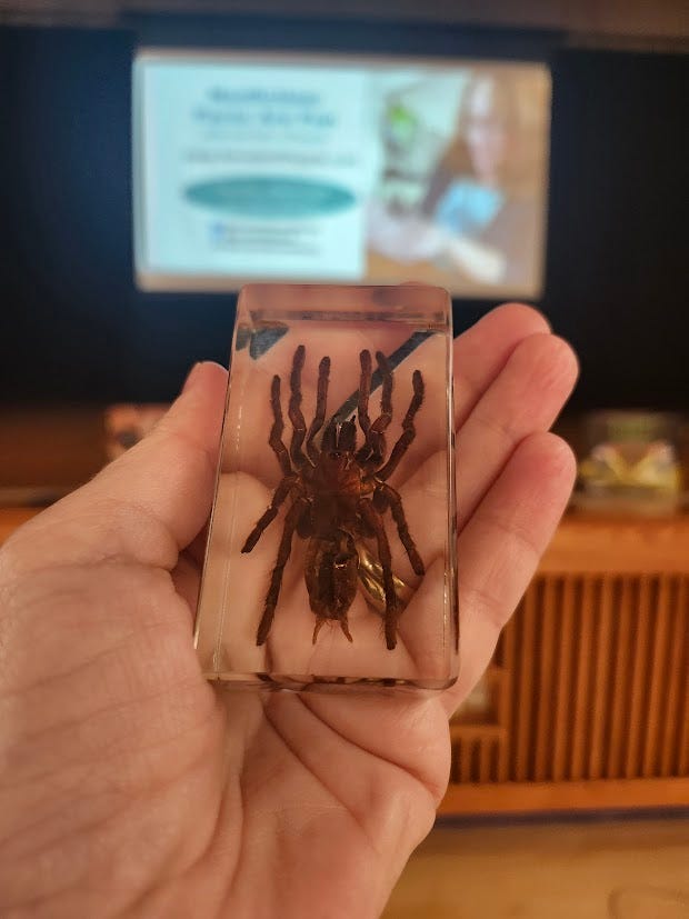 “When I show Edna, Jr. (shown above) to visitors of all ages, I suggest they count her legs and let me know if they notice anything unusual. They typically note that the spider has ten legs. I then use a spread in Scurry! The Truth About Spiders (because it’s easier to see) that it’s actually eight legs and two arms called palps.”