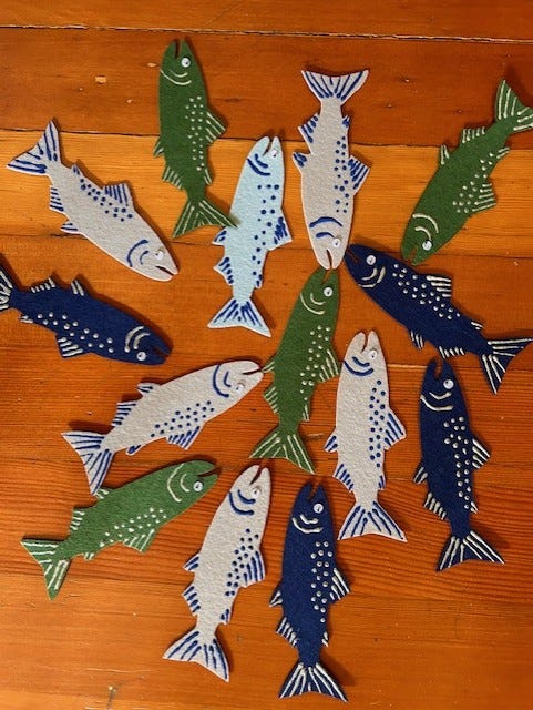 “My informational fiction picture book, SCHOOL OF FISH (Albert Whitman), is based on the popular Salmon in the Classroom program. I made a magnetic fishing game to support it. Kids come up and fish for a question.”