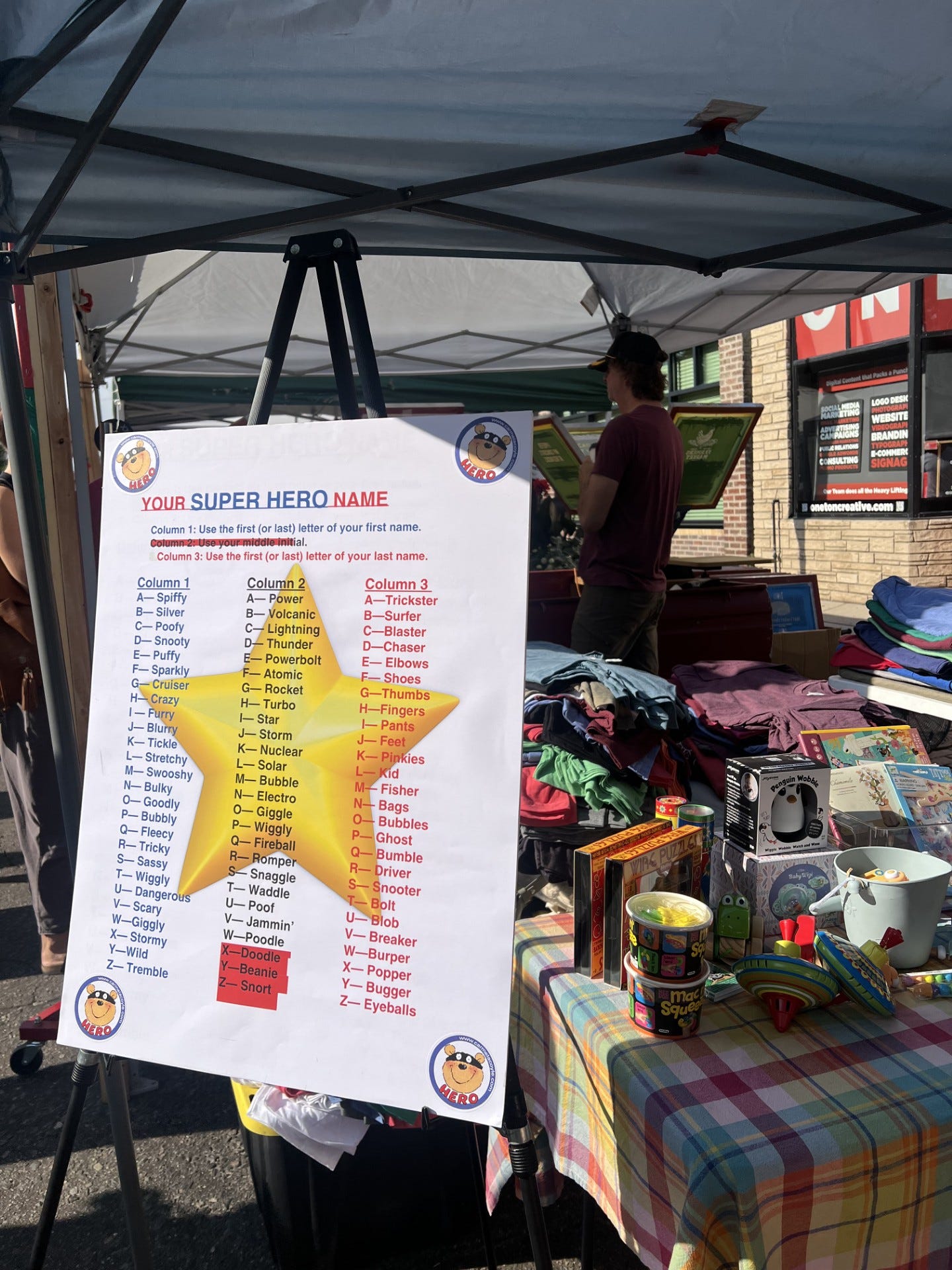 “Once they find their superhero name, I engage them in conversation, and that’s when they notice the other books on my table. But also, I think in general the sign drew them into [the bookstore’s] cubby to look around a bit.”