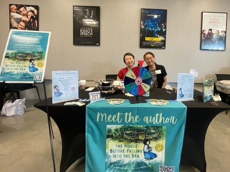 “On the spinner, I usually include candy, stickers, and toys that relate to my book as much as possible. While the kids are spinning the wheel, I have visuals for the parents (like the interactive poster). I also give away bookmarks to all. And if you top that with a smile and a welcoming, generous spirit, it all works together to draw people in for at least a conversation.”