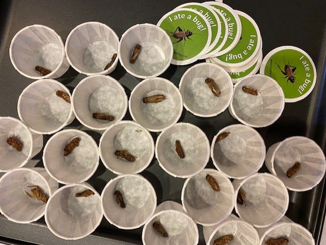 “My middle-grade book, BUGS FOR BREAKFAST (Chicago Review Press), is about entomophagy – the practice of eating insects. Nothing gets kids – and adults – talking like the opportunity to try crickets and/or grasshoppers for themselves. I hand out I ATE A BUG stickers to those willing to sample.”